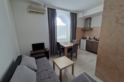 Veliki apartman 60 kvadrata sa dve zasebne sobe, dnevnim boravkom, kuhinjom i velikim kupatilom sa hidromasažnom kadom.