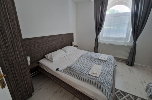 Spavaća soba je premljena udobnim krevetima (jedna francuski i jedan singl ležaj), noćnim ormarićima i ormarima.