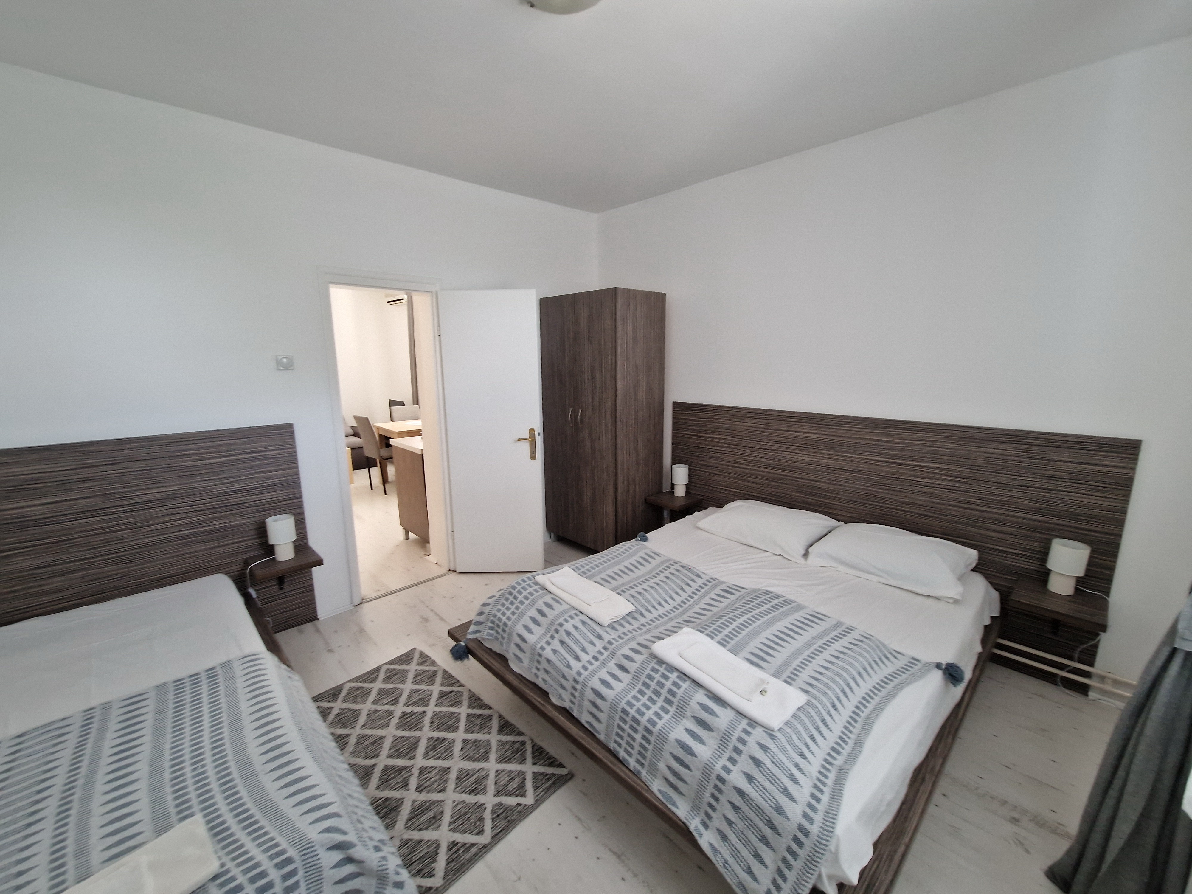 Spavaća soba je premljena udobnim krevetima (jedna francuski i jedan singl ležaj), noćnim ormarićima i ormarima.